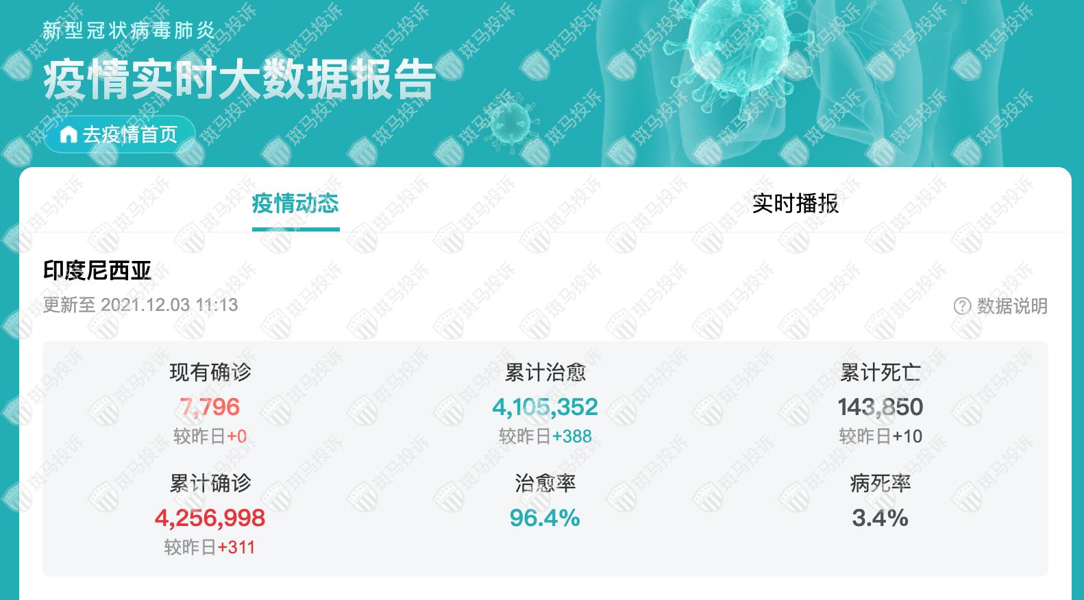 印尼新冠疫情最新消息:截至2021年12月03日11时,印尼昨日新增311例确诊,新增治愈388例,新增死亡10例,现有确诊7796例,病毒死亡率3.4%。
