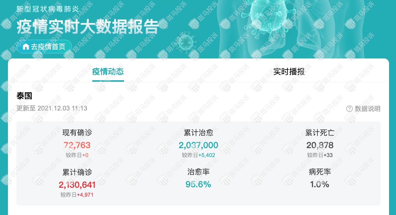 泰国新冠疫情最新消息:截至2021年12月03日11时,泰国昨日新增4971例确诊,新增治愈5402例,新增死亡33例,现有确诊72763例,病毒死亡率1.0%。