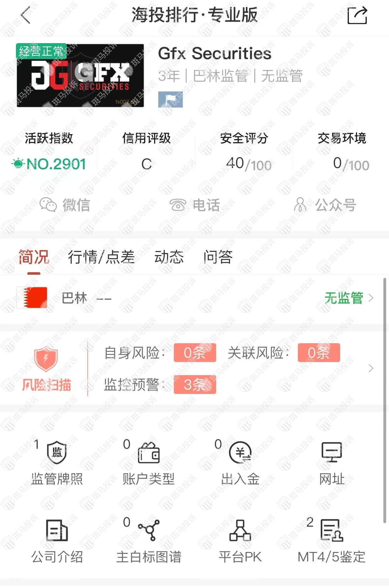 这家平台叫Gfx Securities,成立于2019年,全球排名2901名,目前无监管,但是没有外汇牌照,不能做外汇保证金交易,风险扫描显示3条风险,投资者资金安全无保障。