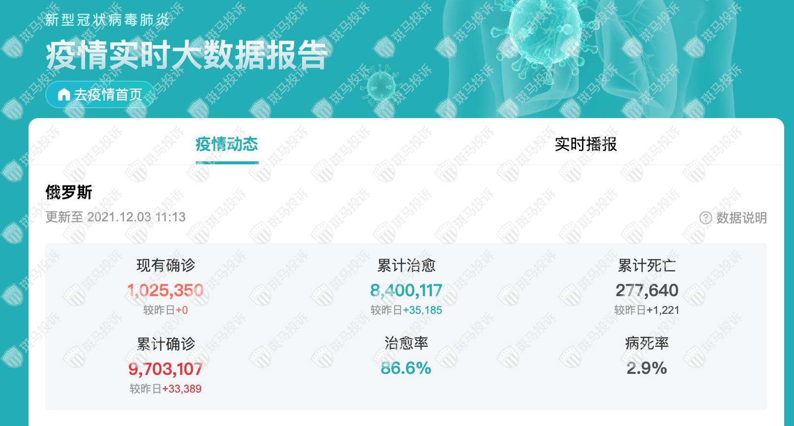 俄罗斯新冠疫情最新消息:截至2021年12月03日11时,俄罗斯昨日新增33389例确诊,新增治愈35185例,新增死亡1221例,现有确诊1025350例,病毒死亡率2.9%。