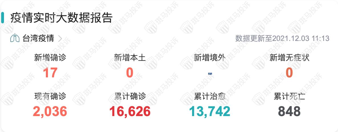 :截至2021年12月03日11时,台湾昨日新增17例确诊,累计确诊16626例,现有确诊2036例,累计死亡848例。