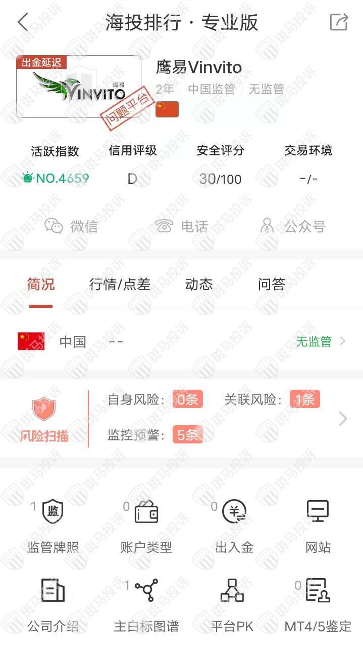 据海投排行资料显示,Vinvito鹰易平台成立于2020年,全球排名4659名,目前出金延迟且无监管,没有外汇牌照,不能做外汇保证金交易,风险扫描显示6条风险,投资者资金安全无保障。