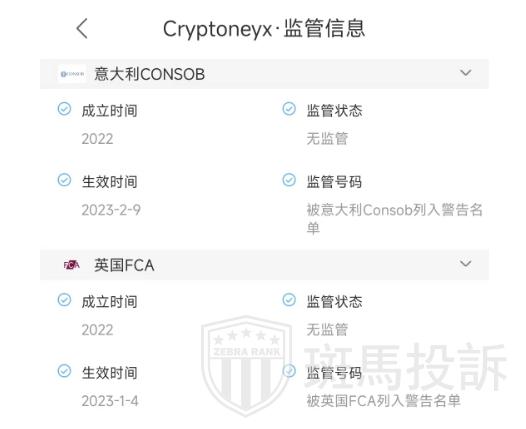 Cryptoneyx平台不受FCA/PRA的监管,未经英国FCA的允许就在英国展开金融活动,被英国FCA列入警告名单;同时还查询到近日也被意大利Consob列入警告名单,涉嫌虚假宣传,除此之外缺乏有效的金融监管,不能做外汇相关交易业务,投资风险极大,投资者投资需谨慎!