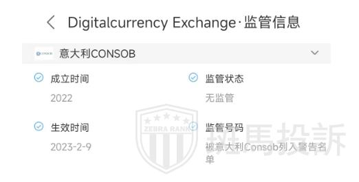 Digitalcurrency Exchange平台由专业的外汇和加密货币交易员团队创立。公司在英国合法注册,不过据查询,不管是英国FCA还是英国工商局都没有该平台的信息,反而在意大利CONSOB查出被拉入警告名单,属于在没有招股说明书的情况下提供金融产品的网站,是不安全的,投资者投资要谨慎对待,以免出现损失无法追回的局面。