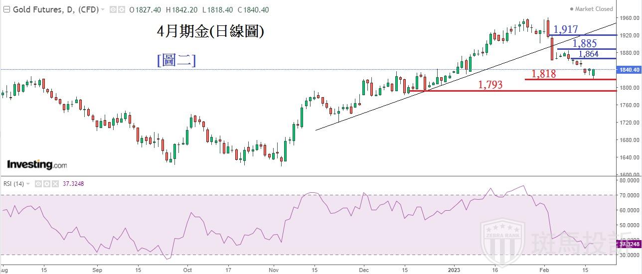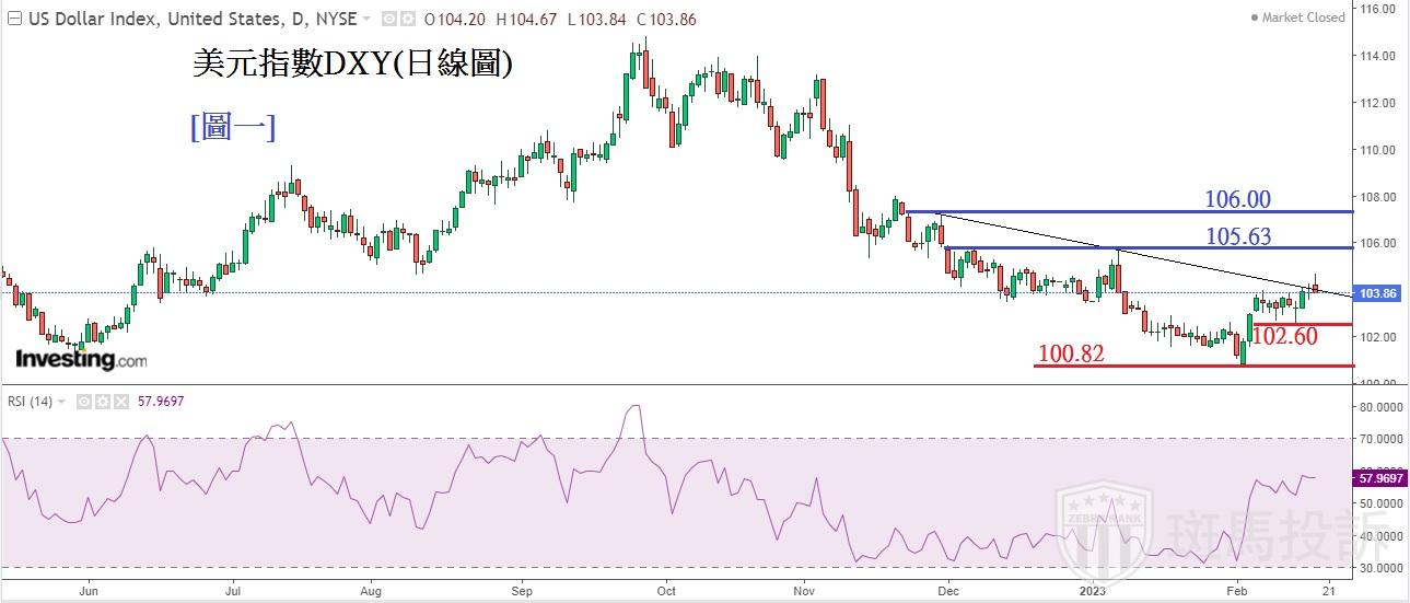 见下方[图一]美元指数DXY(日线图),上周二因美国CPI结果高于预测,令美元指数从102.60一直上升至周五,周五因联储局最鹰派官员布莱德(Bullard)表示或有机会在3月加息0.5%,美元指数一度曾升穿下降通道线(黑色幼线显示),最高曾升至104.67,但收市前回落并在103.86收盘,返回下降通道线之下,暂时仍可界定为「未升穿」,可能是市场事后发觉到这位超级鹰派官员在今年并没有投票权。