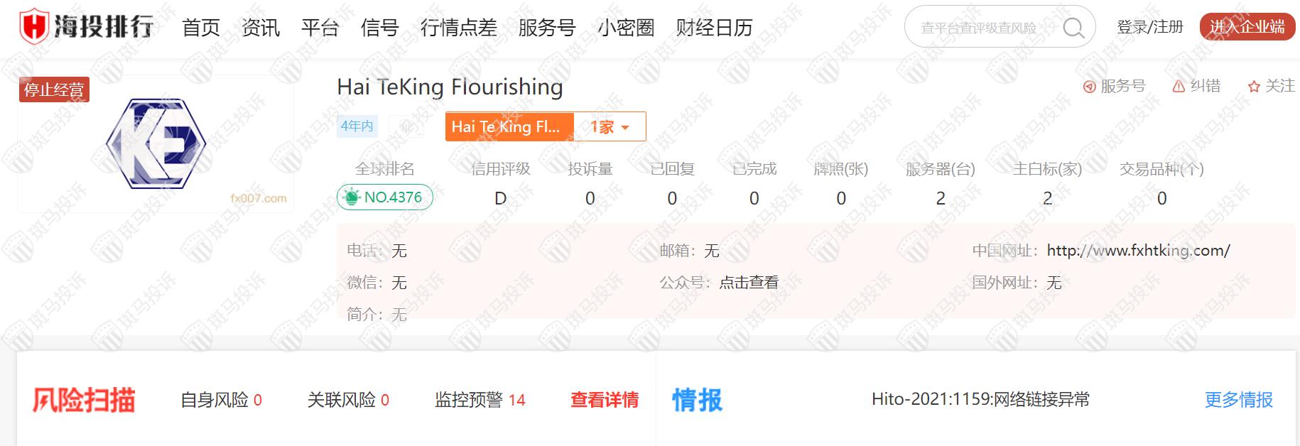 这家平台叫Hai TeKing Flourishing,成立于2020年,全球排名4376名,目前无监管,没有外汇牌照,不能做外汇保证金交易,投资者资金安全无保障。海投排行显示Hai TeKing Flourishing平台已停止经营。