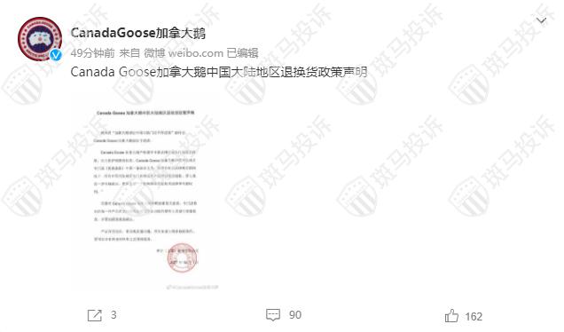 12月1日上午,加拿大鹅官方微博就中国大陆地区退换货政策发布声明,声明称在符合相关法律规定的情况下,所有中国大陆地区专门店售卖的产品可以退货退款。