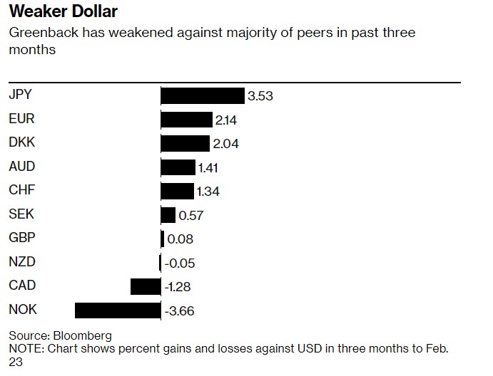 投资者表示,美元正在走低,原因是美联储的加息周期接近尾声,并且随着各央行继续收紧货币政策,其他几乎所有货币都将走强。虽然最近的数据让交易员重新思考美国利率将走多高,但由于他们押注美元的强劲势头将缓和,风险资产已从美股转向新兴市场。