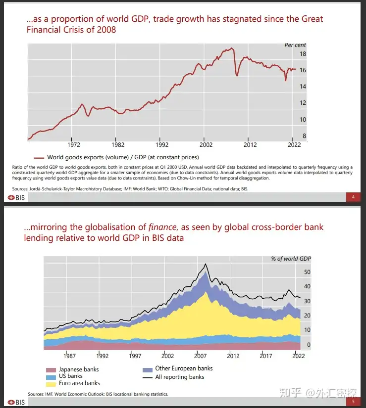 关键点1:虽然全球GDP和全球贸易规模都在持续增长,但以全球贸易/全球GDP的比例来看,去全球化确实是在发生的。这同样在金融数据上得以验证——目前全球跨境银行贷款占GDP的比例同样在下降。