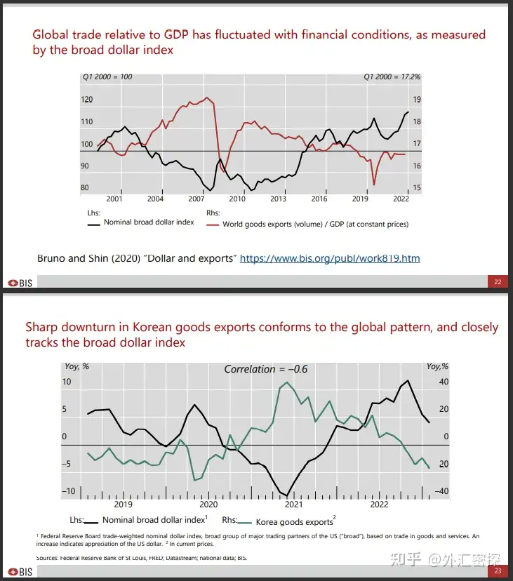 这与我们的传统认知不符——人们总是认为美元升值时,出口国的数据会伴随着本币兑美元贬值而改善,因为出口的商品变得更加“廉价”了。Shin用过去五年韩国的数据来证明这一点,韩国的商品出口与美元指数负相关。