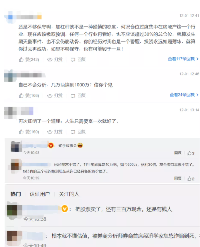对于这篇帖子,有网友质疑其真实性,有网友提出其投资策略不够谨慎,还有观点称“从几万到300万,已经是成功的投资了”。