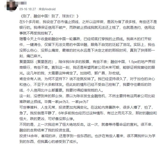 由于重仓加杠杆,股价下跌给这名投资者带来巨大损失,据帖子中晒出的图片,仅融创就亏损了超300万。