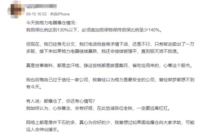 该网友表示:我担保比例达到130%以下,必须追加担保物保持担保比例至少140%。但现在,我已经身无分文,我打电话给券商求情也不行,只有被动卖出了一万多股,接下来如果格力电器继续暴跌,还会继续被强平,直到毁灭资不抵债。
