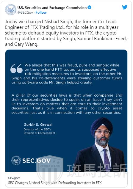对Singh的指控与CFTC此前对Bankman-Fried、FTX、Alameda、FTX联合创始人Gary Wang和Alameda联合首席执行官Caroline Ellison提起的诉讼有关,该诉讼称,一个欺诈性计划导致FTX客户资产损失超过80亿美元。