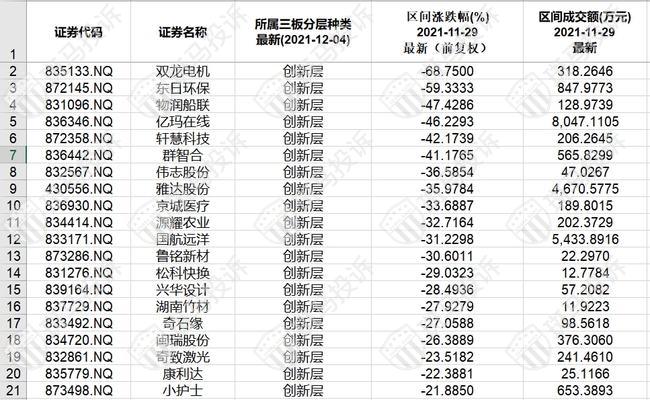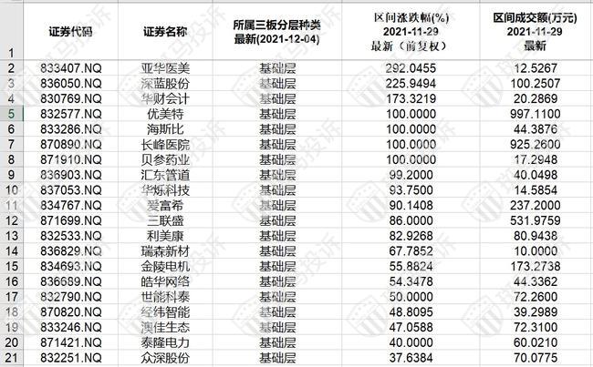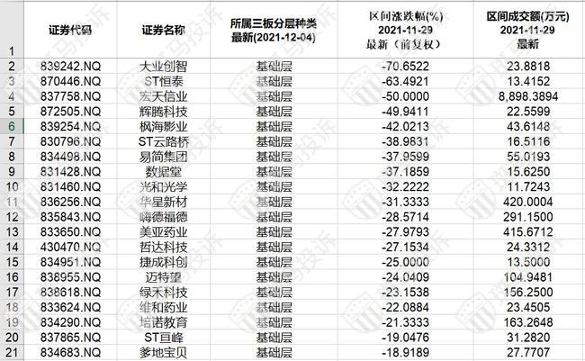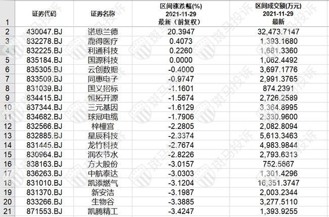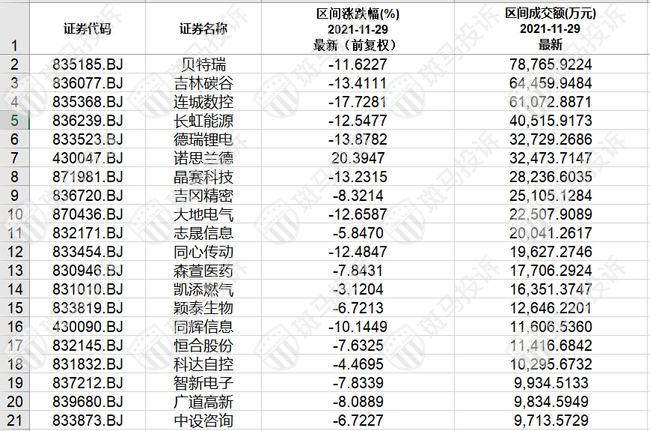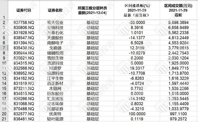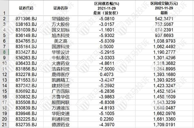 北证A股成交额排名后20
