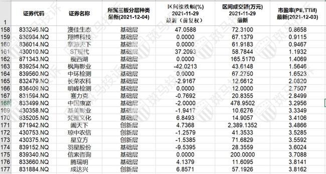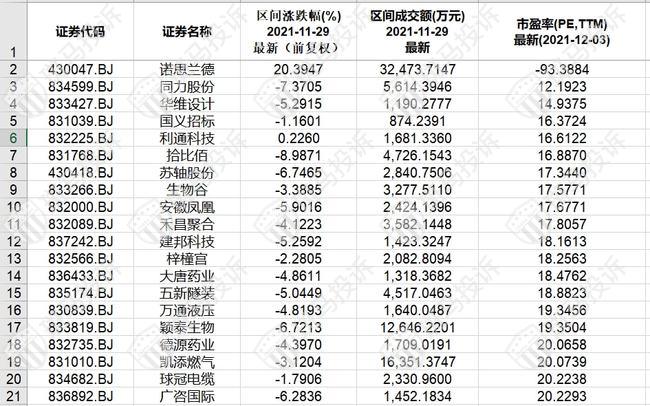 北证A股市盈率(PE)最低的20只股票