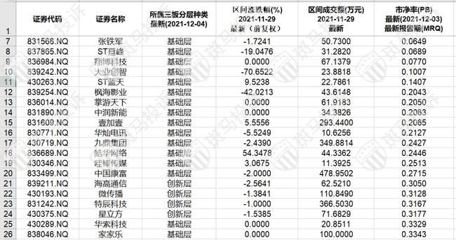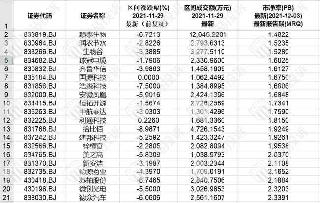 北证A股市净率(PB)最低的20只股票