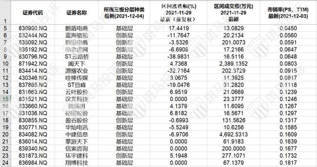 北证A股市销率(PS)最低的20只股票