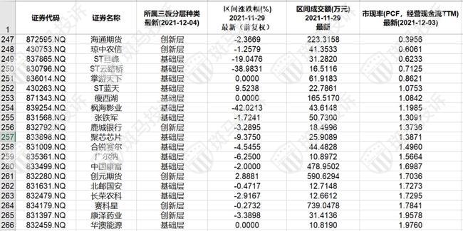 新三板市现率(PCF)最低的20只股票。(已剔除周成交额低于10万的,亏损的)
