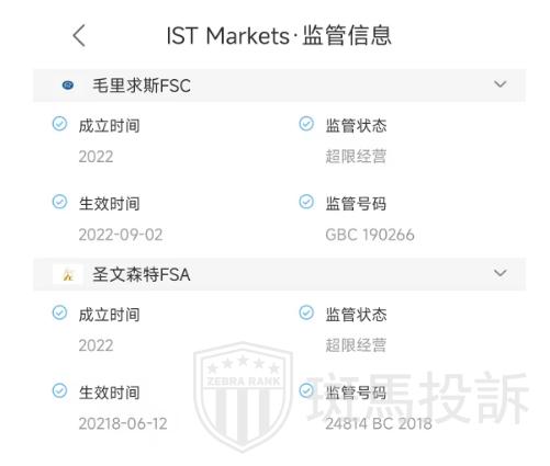 IST Markets平台在圣文森特和格林纳丁斯注册成立,受圣文森特和格林纳丁斯金融服务管理局监管,编号:24814 BC 2018。同时也受毛里求斯金融服务委员会监管和授权,许可证号为:GBC 190266。这两个监管都属于超限经营的范畴,取得金融服务牌照,有投资意向的用户可以投资,同时要注意规避交易风险。