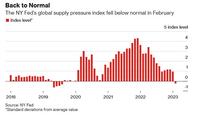 纽约联储(NY FED)在当地时间周一公布的一项统计数据显示,在新冠疫情于全球范围内爆发近三年后,全球供应链已恢复正常。最新的数据显示,全球供应压力实际上已降至正常水平以下,纽约联储公布的2月份全球供应链压力指数为-0.26,自2019年8月以来首次达到负值。