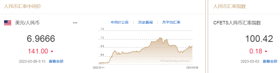 3月9日,人民币中间价报6.9666,下调141点,上一交易日中间价报6.9525,在岸人民币上一交易日收报6.9706。
