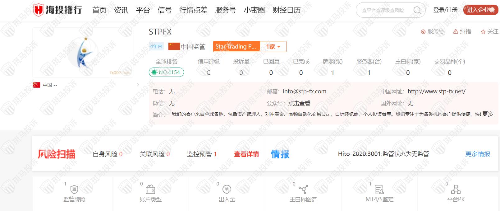 这家平台叫STPFX,成立于2018年,全球排名4154名,目前无监管,没有外汇牌照,不能做外汇保证金交易,投资者资金安全无保障。海投排行显示该平台STPFX停止经营。