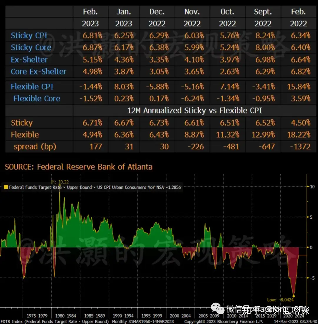 那要看你看什么指标。表明上,通胀和核心通胀的整体水平继续缓慢下行,但是环比加速。同时,一月的PCE个人消费通胀超预期并环比加速。市场似乎忘了,这个数据才是美联储关注的、最重要的通胀数据。而亚特兰大联储的“黏性通胀率”继续大幅走高,但“非黏性通胀”,也就是价格容易变化的商品的通胀率大幅走低,使整体通胀水平略降(如图)不知道决定人们生活成本负担的是哪一类通胀?还是市场共识装聋作哑。