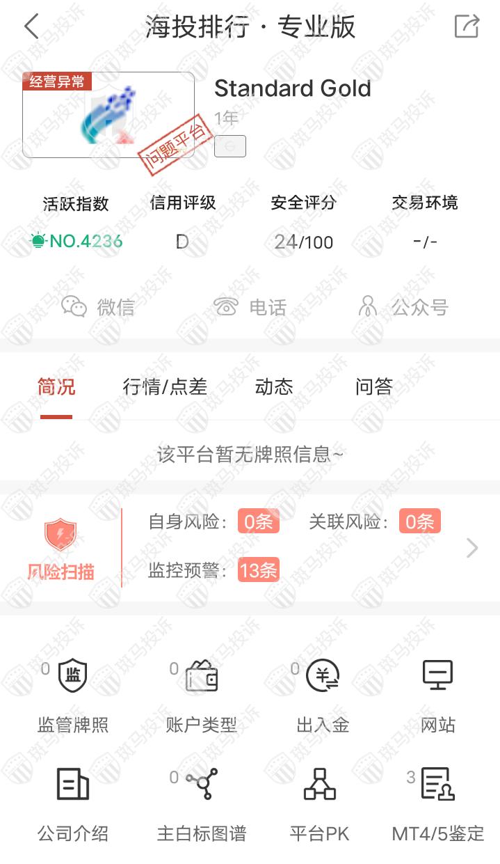 这家平台叫Standard Gold,成立于2021年,全球排名4236名,目前无监管,没有外汇牌照,不能做外汇保证金交易,风险扫描显示13条风险,投资者资金安全无保障。