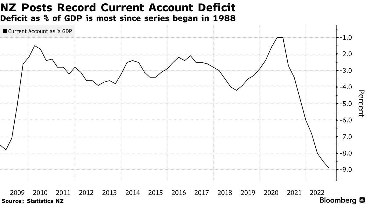 标普对新西兰的外币和本币评级分别为AA+和AAA,但该机构一直指出,新西兰的外部失衡是一个关键风险。根据新西兰周三最新公布的数据显示,由于该国进口的商品和服务超过了出口,2022年经常账户赤字占国内生产总值(GDP)的比例飙升至8.9%。