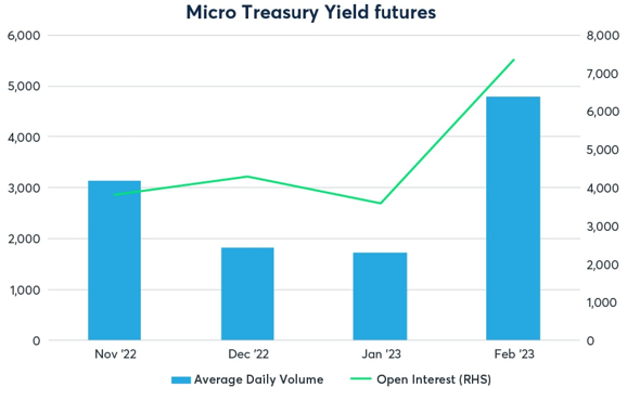 2月份,2年期美国债收益率上涨超过70个基点,加深2年期与10年期美债收益率倒挂,更多交易员运用微型美国债收益率期货以参与美国国债市场。因此,微型2年期收益率期货和微型10年期收益率期货均创下未平仓合约记录,2月份的交易量较前三个月的平均水平跃升115%。下图显示最近微型美国债收益率期货的日均交易量和未平仓合约持续上升。