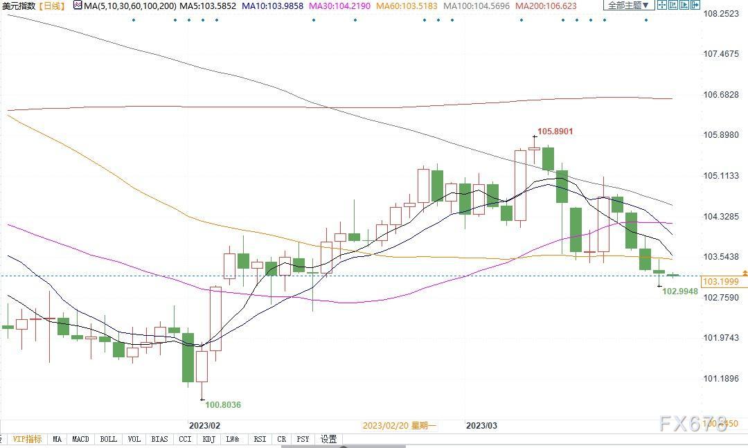 综合以上消息可能看到,市场预期本周美联储加息25个基点,甚至可能不加息,加息50个基点的概率较小,投资者需警惕美元指数(103.1722,-0.0477,-0.05%)反弹力度有限。