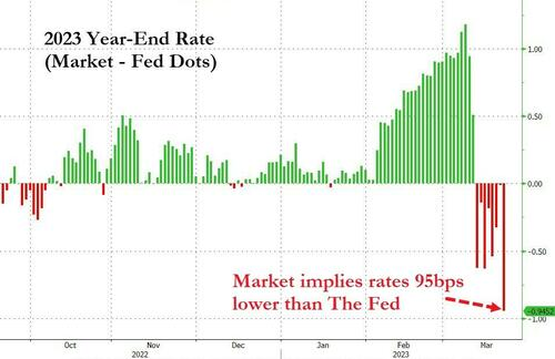 如今,利率市场的定价已经比美联储的点阵图预期低出了95个基点,这预示着整整多定价了近四次25个基点的降息。
