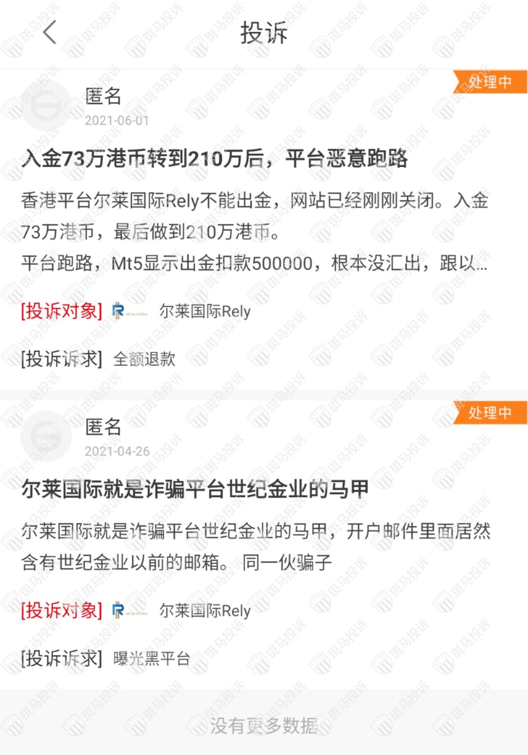 尔莱国际Rely平台现在在斑马投诉有2条投诉,皆未处理。