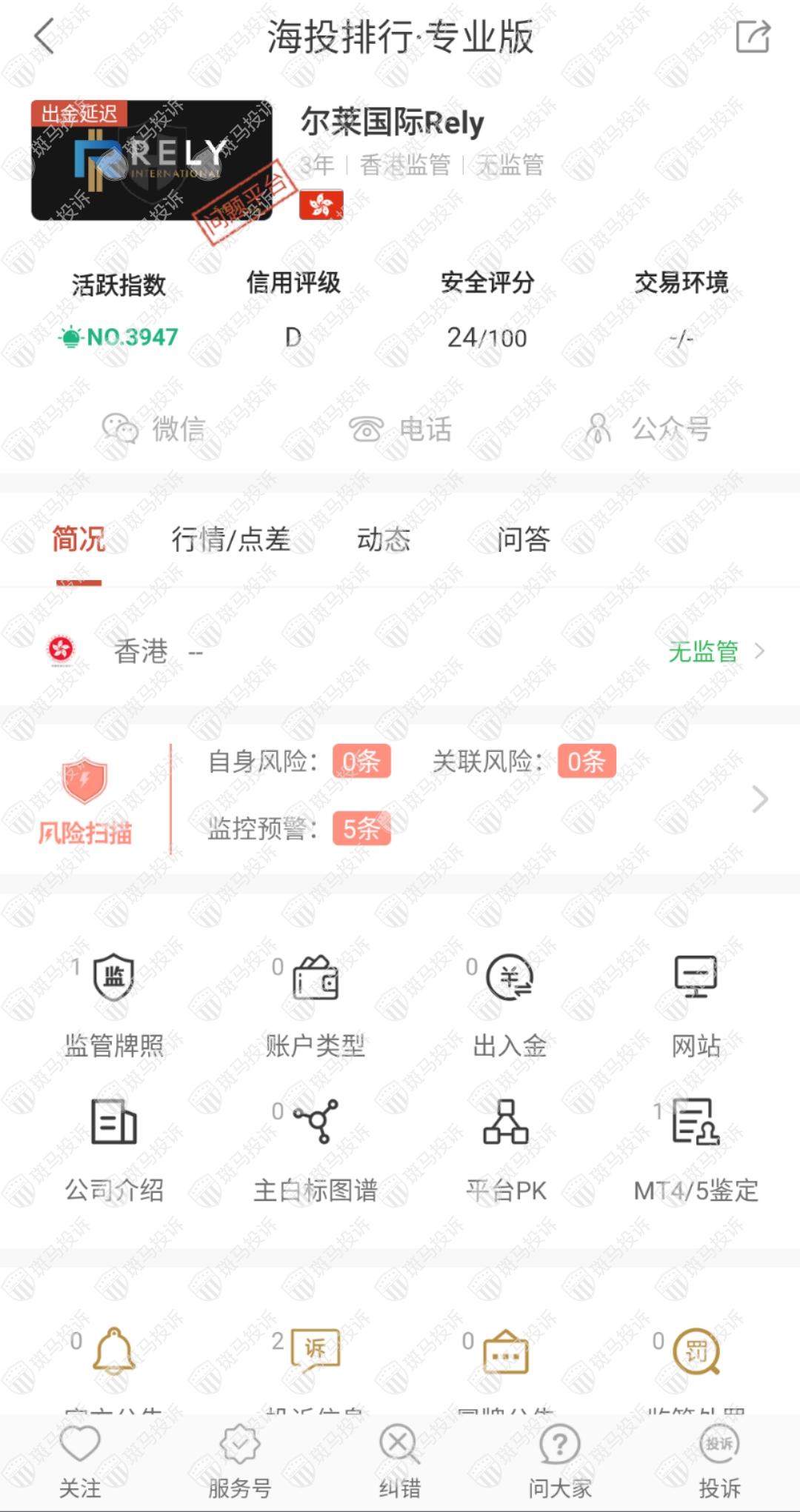 据海投排行资料显示,尔莱国际Rely平台成立于2019年,全球排名3950名,目前无监管,没有外汇牌照,不能做外汇保证金交易,风险扫描显示5条风险,投资者资金安全无保障。