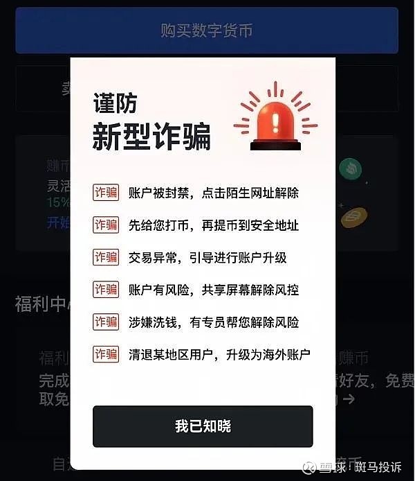 其实在各大交易平台首页皆有类似“谨防新型诈骗”的提醒通知。OKEx通知中便提到了六大诈骗手法:1、账户被封禁,点击陌生网址解封;2、先给您打币,再提币到安全地址;3、交易异常,引导进行账户升级;4、账户有风险,共享屏幕解除风控;5、涉嫌洗钱,有专员帮您解除风险;6、清退某地区用户,升级为海外账户。