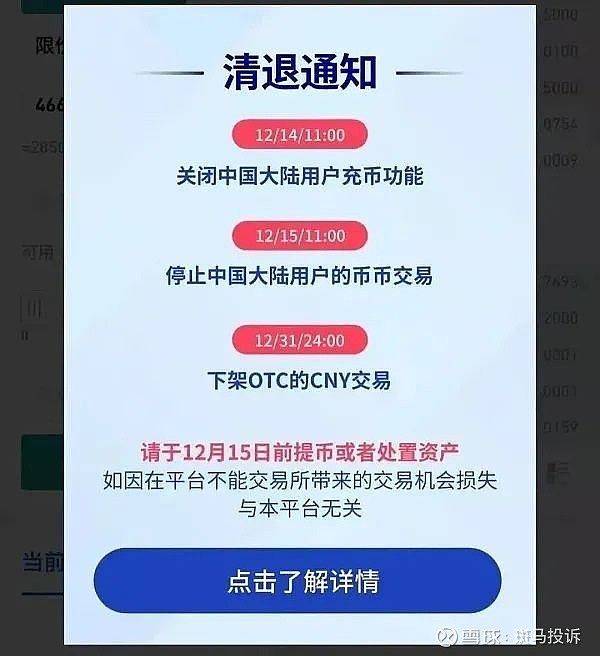 自12月1日起,火币全球站(Huobi Global)平台官网和APP每天都会弹出强制停留5秒的‘清退通知’,以显眼字样注明该交易所清退中国大陆用户的时间线:12月14日11:00,关闭中国大陆用户充币功能;12月15日11:00,停止中国大陆用户的币币交易;12月31日24:00下架OTC的CNY交易。