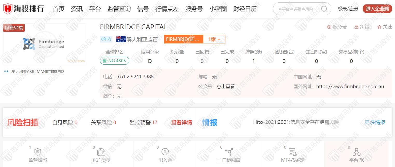 这家平台叫FIRMBRIDGE CAPITAL,成立于2014年,全球排名4805名,受澳大利亚ASIC监管,目前该平台经营异常,官网网址无法打开,风险扫描显示17条风险,投资者需注意其风险信息。