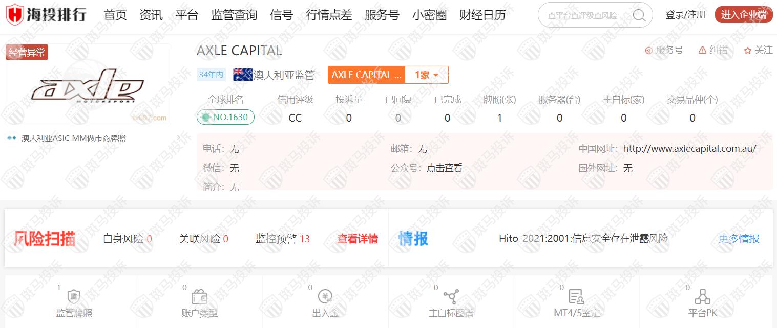 这家平台叫AXLE CAPITAL,成立于2010年,全球排名1630,受澳大利亚ASIC监管,目前该平台经营异常,官方网址无法打开,风险扫描显示13条风险,投资者需注意其风险信息。