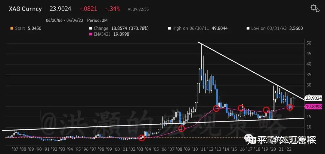 此刻,银子的季线正在走出一个40年的大三角形态,并在3.5x3年的10.5年中周期线上获得支持,强势反弹(如下图)。