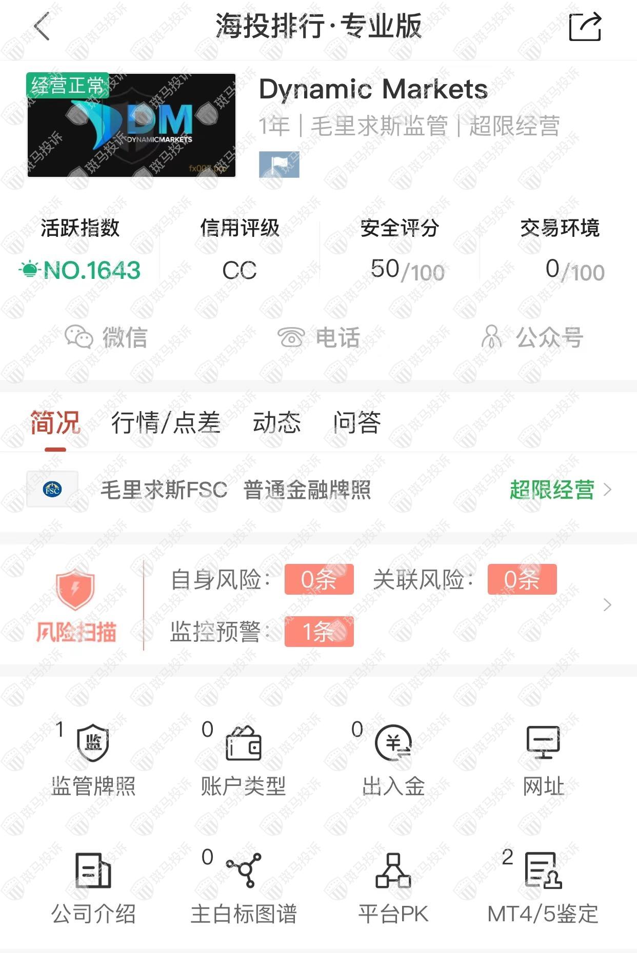 这家平台叫Dynamic Markets,成立于2021年,全球排名1643名,目前有毛里求斯FSC监管,但是没有外汇牌照,不能做外汇保证金交易,风险扫描显示1条风险,投资者资金安全无保障。