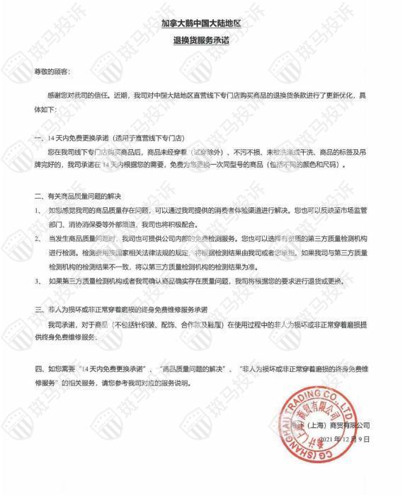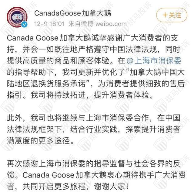 12月9日晚间,加拿大鹅官方微博发布公告称,在上海市消保委的指导帮助下,公司更新并优化了加拿大鹅中国大陆地区退换货服务承诺。