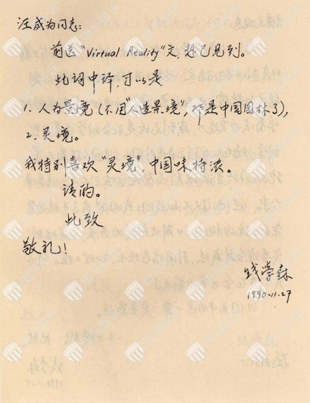 活动现场还展示了钱学森50多封关于“灵境”信件。1990年11月27日,钱学森在写给汪成为院士的信中提到,“Virtual Reality”中文译名可以是“人为景境”或“灵境”,并表示他“特别喜欢‘灵境’,中国味特浓”。