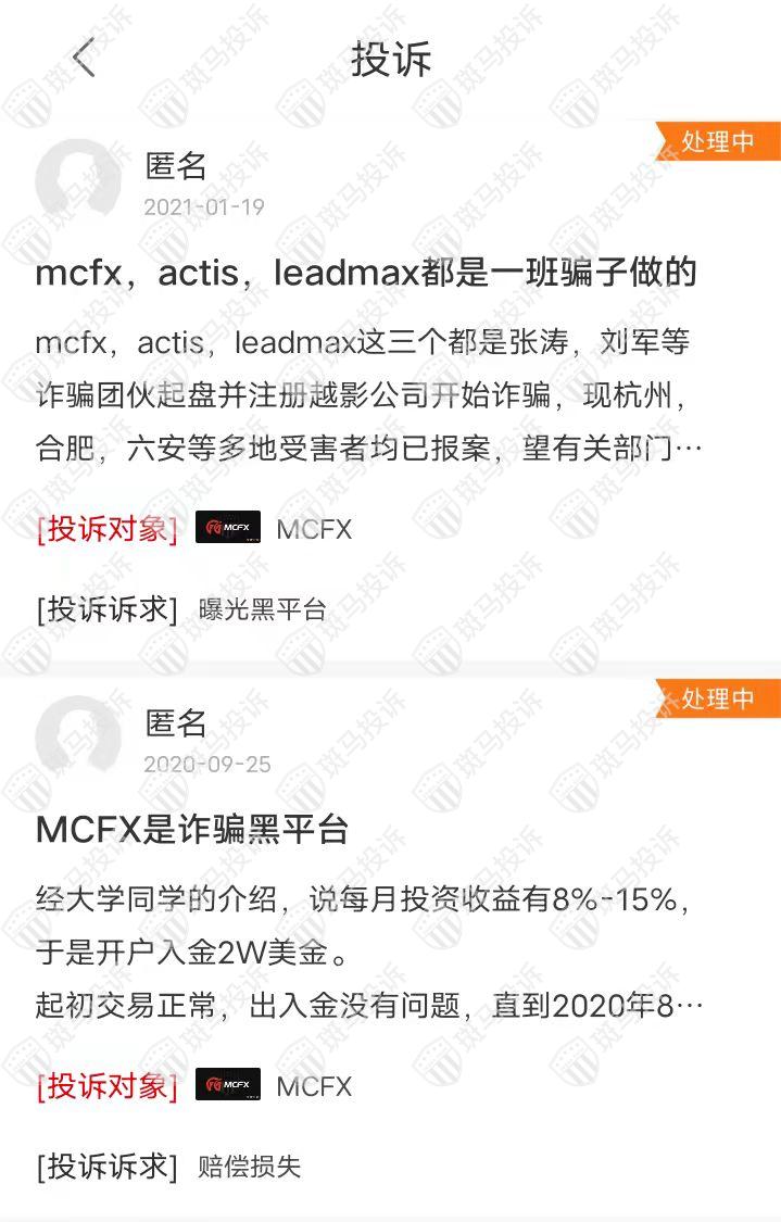 JDHK的关联平台MCFX目前在斑马投诉已收到2条投诉,且仍在处理中。