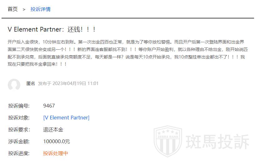 它的新马甲为V Element Partner,同样以出金问题而时常被用户投诉,近日就有用户在斑马投诉上反馈道,开户后入金很快,10分钟左右到账。第一次出金四百也正常,就是为了等你放松警惕。而且开户后第一次登陆界面和出金界面第二天很快就会变成另一个,新的界面连客服都找不到。等你账户开始盈利,就以各种理由不给出金,刚开始说匹配不到承兑商,后面就直接承兑商额度不足,每天都是一样?说是每天10点开始承兑,我10点整挂单出金都出不了!!!我现在只要把我本金拿回来!!