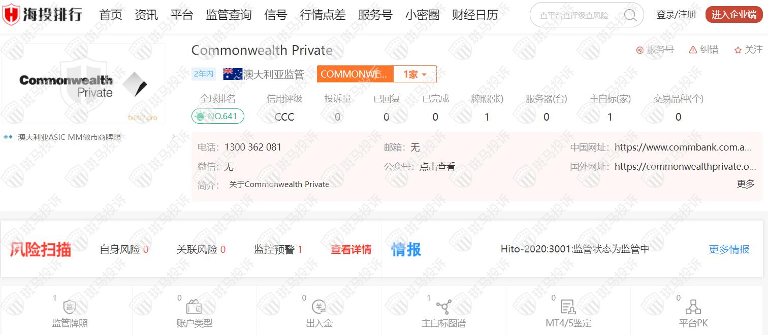 Commonwealth Private成立于2020年,全球排名641,目前受澳大利亚ASIC监管,监管号码314018,风险扫描显示1条风险,投资者需注意其风险信息。