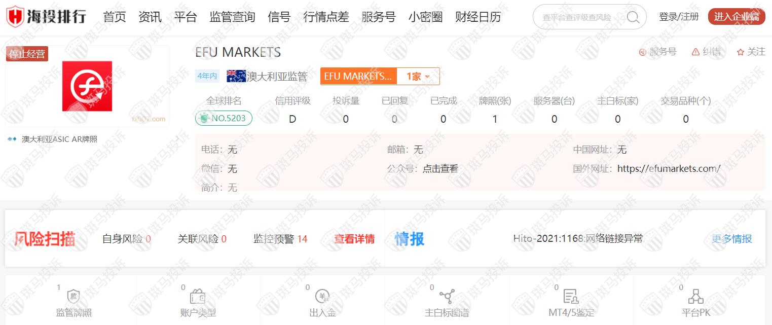 这家平台叫EFU MARKETS,成立于2018年,全球排名5203名,目前停止经营,监管失效,没有外汇牌照,不能做外汇保证金交易,风险扫描显示14条风险,投资者资金安全无保障。