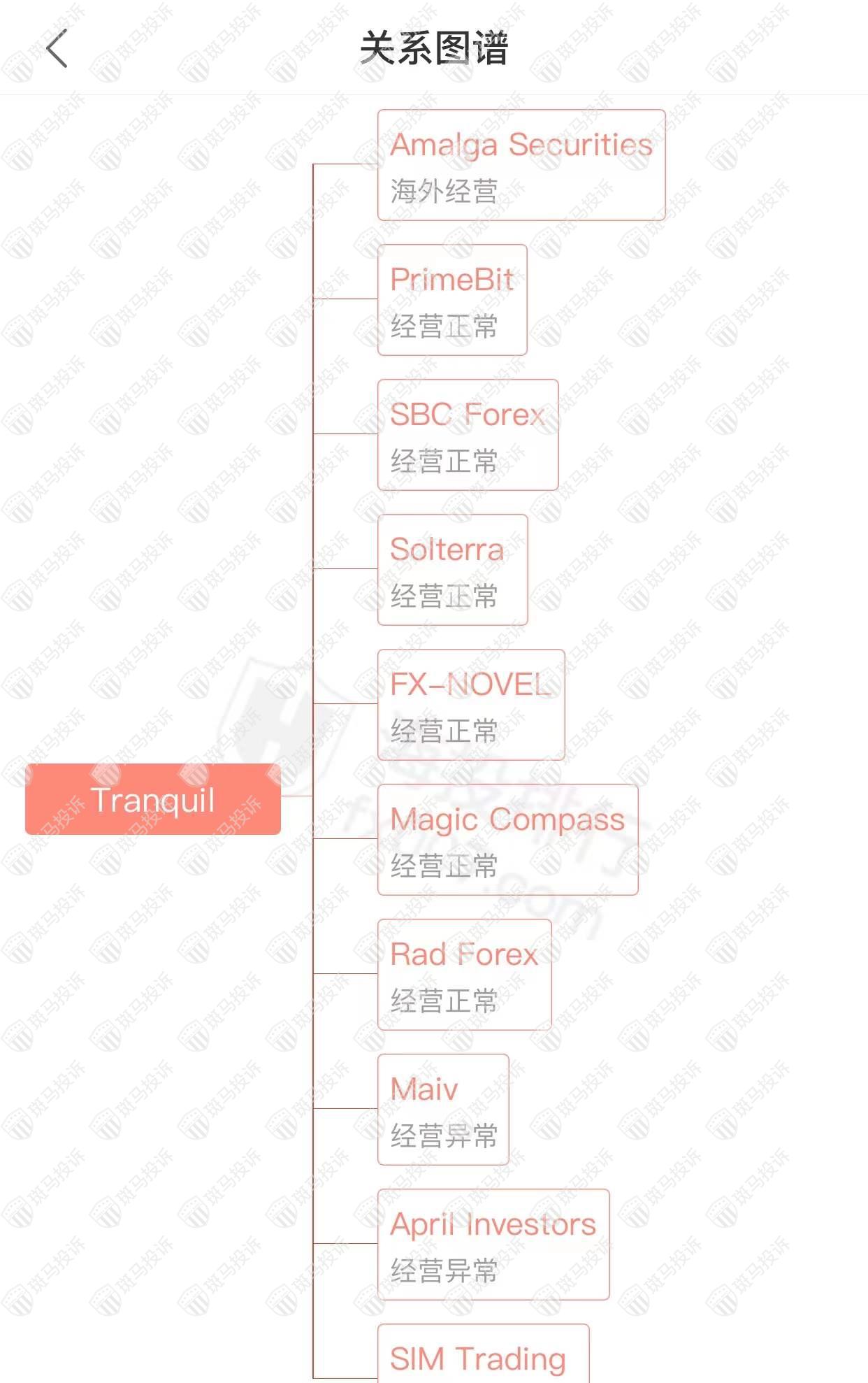 主白标关系显示,Tranquil平台和10家平台存在关联,其实2家出现经营异常的情况。