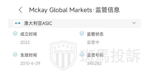Mckay Global Markets平台是一个比较特殊的平台,主营业务是提供一般建议批发许可服务和托管全权委托账户(MDA)经理,没有提供金融交易产品,无法开展外汇业务,据查询是在澳大利亚ASIC注册,许可证号:346282,取得MM做市商牌照。