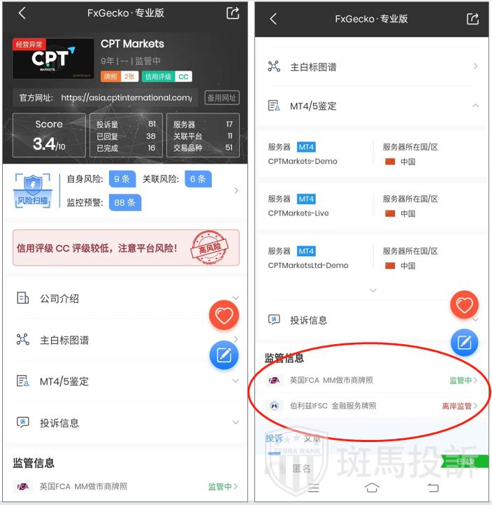 FxGecko数据显示,CPT Markets在2008年成立于英国伦敦,2012年进军中国市场,平台宣称获有英国FCA牌照,但还有一个伯利兹的离岸监管牌照,两个牌照的客户保障天差地别,而大部分客户的开户公司通常是离岸监管的这个,监管力度不高,客户权益没有保障。